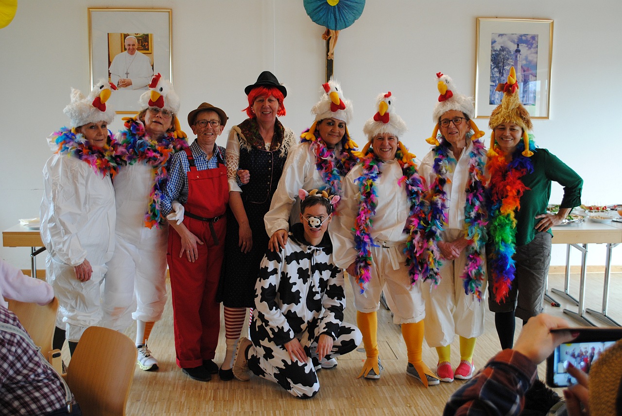 Bäuerinnen, Bauern, Mägde, Knechte, Vogelscheuchen, Ferkel, Kühe, Hühner, Schafe und sonstige tolle Verkleidungen, die zum Motto passten, freuten sich über das tolle Frühstücksbüffet und die lustigen Darbietungen: „Resi i hoa die mit meim Traktor ab“, einem Hühnergesang mit Klavierbegleitung, einem poppigen Hühnerkonzert, einer lustigen Enkel-Oma-Geschichte von Frau Lechner und dem stottrigen Kündigungsgespräch zwischen Bauer und Magd. Besonders freute sich die Vorstandschaft über den Besuch der Spielgruppenmuttis mit ihren kleinen Kindern, die ebenfalls nette Kostüme trugen und viel Spaß hatten. Kurz nach Mittag war der Fasching beendet und das Büffet gut leer gegessen. Schee war's, guat war's, lustig war's. Was will man mehr! Bilder über diesen tollen lustigen Vormittag gibt es unter Bilder Frauenbund "Auf dem Bauernhof". Wer sich das untere Bild ansieht, merkt, sogar dem Papst Franziskus hat unser Fasching gefallen.