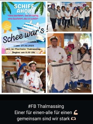Unter diesem Motto trafen sich 100 Frauen zum Faschingsfrühstück am „Unsinnigen Donnerstag“ 27. Februar 2025 im sonnenerfüllten Pfarrheim. Pfarrer Alexander Ertl, einziger mutiger Mann, verkleidet als Kapitän, eröffnete mit seiner Vorstandscrew in einem beeindruckenden Ozeandampfer den Vormittag. Die Faschingsgäste, maskiert als Matrosen, Kapitäne, Fischer, Fische, Wikinger, Aida-Urlauberinnen samt Kindern, und sonstigen wasserfreundlichen Verkleidungen freuten sich über das herzhafte und süße Frühstücksbüffet. Bei einer Maskenprämierung wurden 3 Gutscheine vom neuen EDEKA Markt in Thalmassing überreicht und bei einer Lotterie 3 Massagegutscheine von „Praxis am Ring“ verlost. Die Gewinnerinnen freuten sich riesig über ihr Glück. Eine lustige Geschichte von der Ehrenvorsitzenden Frau Rita Lechner und fröhliche Witze sorgten für beste Unterhaltung. Nach drei Stunden gingen die Gäste vergnügt und satt wieder an Land.