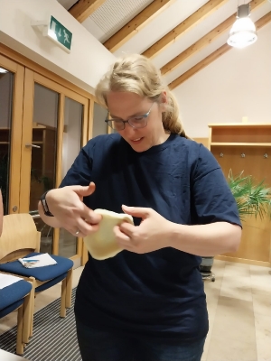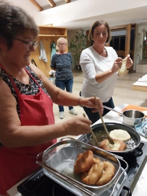 Waltraud Schmidmeier, ein allseits bewährtes und liebenswertes Mitglied unseres Zweigvereins, lernte es von ihrer Mutter und gab dieses Wissen an zwei Abenden an 20 Frauen und drei junge Mädchen weiter. Die Kiachlfans schauten interessiert der Waltraud beim Zubereiten des feinen Hefeteigs zu und wurden von ihr durch alle Arbeitsschritte bis zum fertigen Prachtkiachl sicher angeleitet und unterstützt. Besonders das Ausziehen mit den Fingern, damit die zarte Mitte nicht reißt, forderte Konzentration, bevor die Hefeteilchen ins heiße Fett durften. Die gespannten Hobbybäckerin probierten natürlich ihre Werke und trugen auch noch einige Kiachl zu ihren Familien nachhause. Unsere 1. Vorsitzende Johanna Jackermeier bedankte sich bei Waltraud Schmidmeier für die beiden fröhlichen und köstlichen Abende mit einem kleinen Geschenk. Jetzt kann Kirchweih kommen, mal schauen, ob es gut aus den Häusern nach frischen Kiacheln duftet. Möglich wärs ja, denn Rezepte gab's zum Mitnehmen.