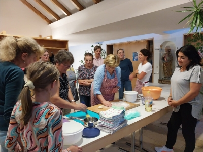 Was unsere Großmütter geschickt konnten, ist für viele von uns Frauen heute noch ein kleines Geheimnis. Da kam uns dieser Kiachl Backkurs am Freitag, 29. September 2023 im Pfarrheim Thalmassing gerade recht, es auch mal zu probieren. Schließlich denken viele von uns noch gerne an unsere Kindertage, als es so lecker in der Küche duftete und wir Kiachl stibitzten und dabei der Oma ein strenges Wort, aber auch ein Lächeln entlockten. Besonders um die Kirchweihzeit ist das Kiachlbacken eine liebe Tradition, auf die man sich so sehr freute und auch heutzutage gepflegt wird.