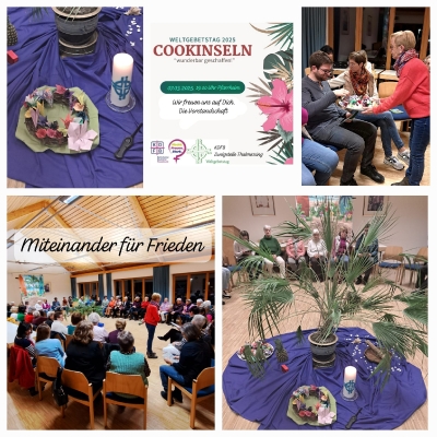Der Weltgebetstag der Frauen am 7. März 2025 fand dieses Jahr im Pfarrheim Thalmassing statt. 50 Frauen und der geistliche Beirat Pfarrer Alexander Ertl wurden mit dem Gruß Kia Orana begrüßt und erhielten als Zeichen des Willkommenseins eine filigran gefaltete Papierblüte. Kia orana bedeutet: "Mögest Du ein langes und erfülltes Leben führen". Die Anwesenden erfuhren von der Vorstandschaft viel über die Cook-Inseln und von drei Frauen, die auf diesen Inseln leben und arbeiten. Mit Wellengeräuschen und Musik wurde dieser Abend untermalt, das sorgte für eine angenehme Stimmung. Auch durften die Gäste süße und herzhafte Köstlichkeiten nach Rezepten der Cook-Inseln probieren und waren sehr begeistert.